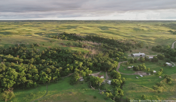 This image looks south. It shows where the northern portion of the Nebraska Sandhills (a 12 million acre grassland landscape) terminates at the wooded breaks of the Niobrara River. The woodland shown here went through the big 2012 wildfire, but many of the trees were protected from fire by the cool, moist north-facing slopes. Those same factors help support tree species (including paper birch) that don’t otherwise seem like they have any right to be in the hot and arid west. Many of the trees in the upper reaches of the draws are bur oaks, along with a few ponderosa pine and eastern red cedar trees that survived the big fire.