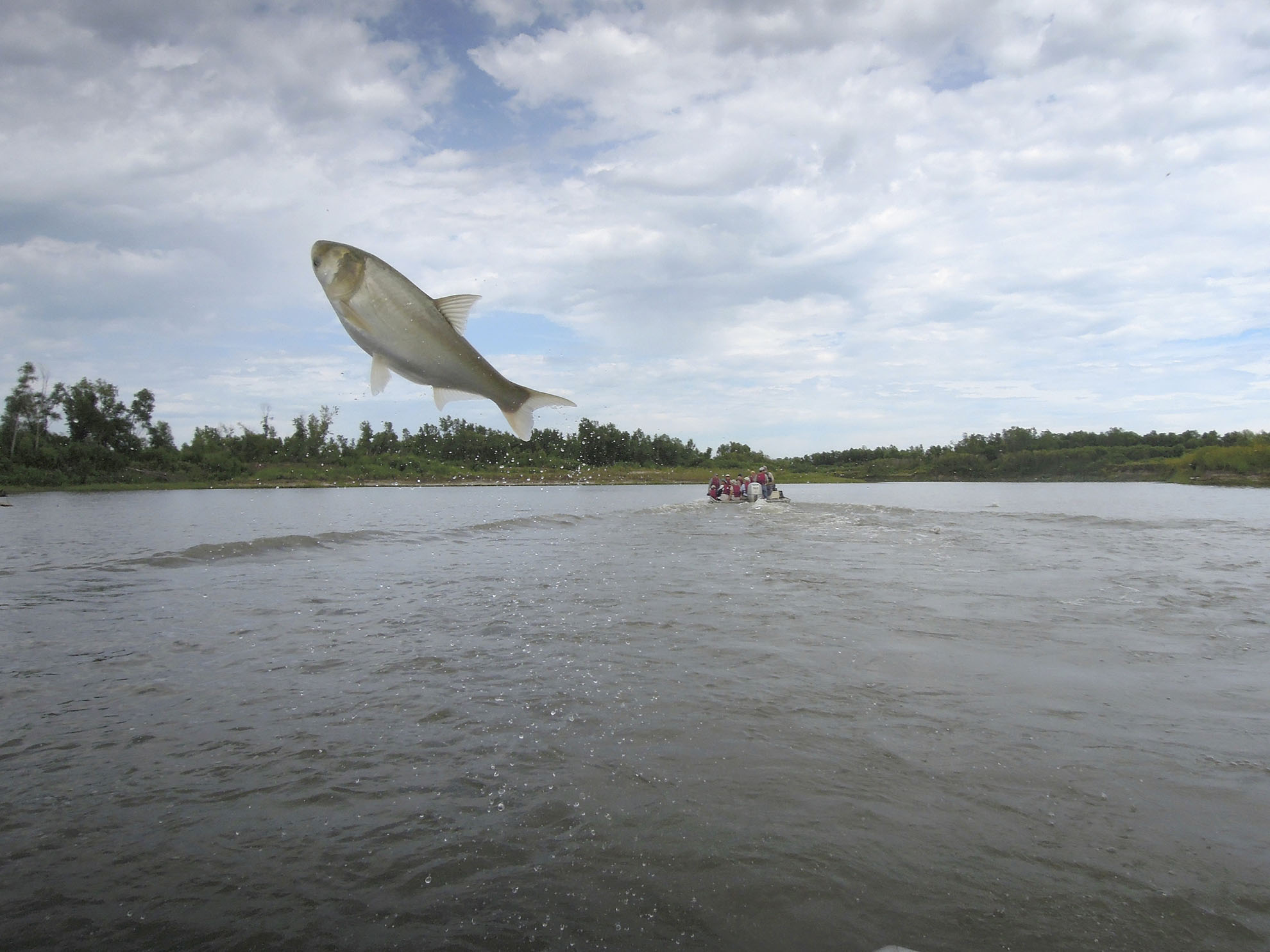 A silver carp dances in front of my camera for a moment during a Missouri River field trip at the Nebraska Natural Legacy Conference. Up ahead is a boat full of Nebraska’s conservationists.