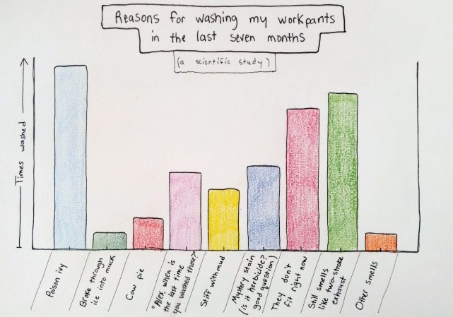 In the last seven months, I have conducted a very scientific study regarding the reasons I have washed my workpants. Although the research is ongoing, I have some results that I think are notable for this audience. One might ask, “are most scientific studies done in colored pencil and marker?” The answer is that although it may seem archaic, I assure you it is still very scientific.
