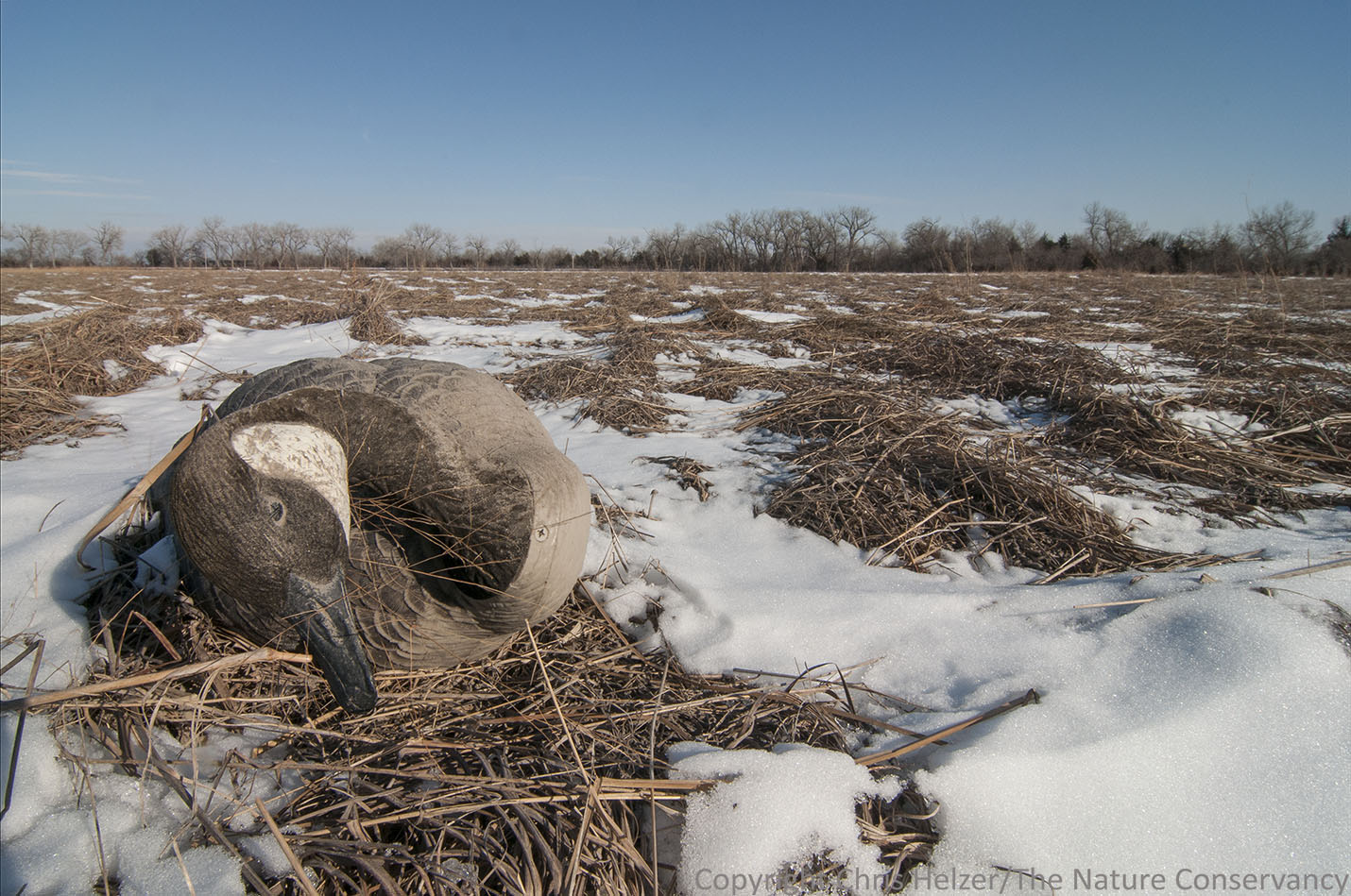 This Canada goose decoy appeared to view its new surroundings with equanimity (look it up, Dillon) after being deposited by receding flood waters.