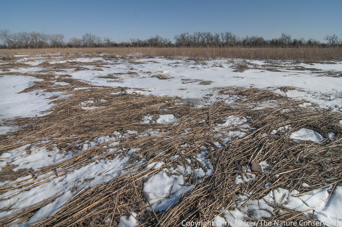 The flooding carried more than just large chunks of ice out of the river and through the prairies. It also picked up and carried downed trees and branches, along with other assorted buoyant objects, natural and man-made. In addition, the ice and water scraped vegetation from some places and deposited it elsewhere. We burned a portion of prairie last year and left it ungrazed as a seed harvest site, so it was covered in tall big bluestem and other grasses. The ice essentially shaved some of that area as it came through, scraping away most of the standing vegetation and leaving behind a site that now looks as if it had been intensively grazed. That shaved off grass was deposited further downstream along obstacles (such as fences) and in high spots as the water levels dropped. As a result, some areas of prairie are now covered by a foot or so of fairly dense thatch. It will be fun to watch how that thatch affects vegetative growth and wildlife use.