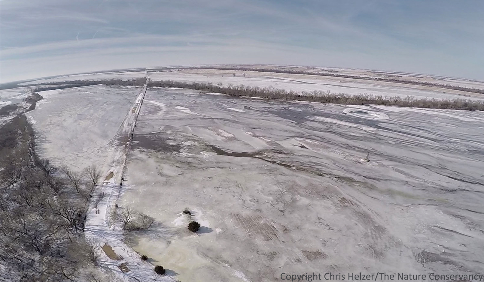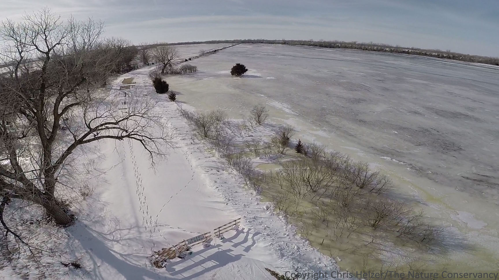As I mentioned last week, recent ice jams on the Platte River caused some flooding in some of our prairies. I was able to photograph the flooding from a couple perspectives. On February 5, we got some aerial footage with our drone, and then late last week, I walked through some of the flooded area after most of the water had receded.