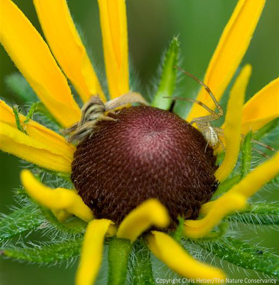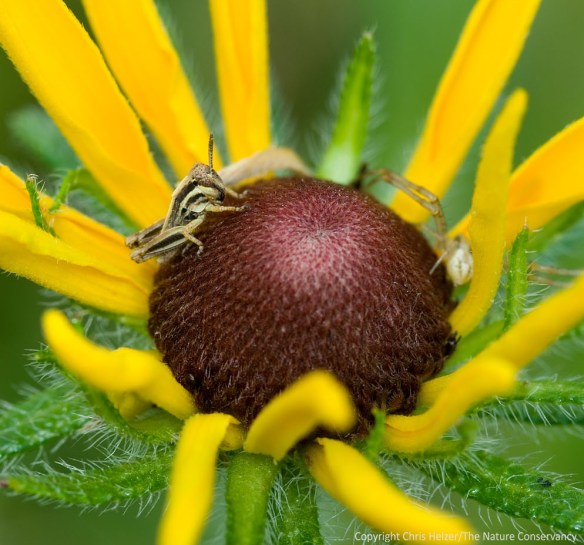A few years ago, I photographed this tiny grasshopper nymph on a black-eyed susan flower. At the time of this photo, I don’t think the nymph was aware of the crab spider it was sharing the flower with…