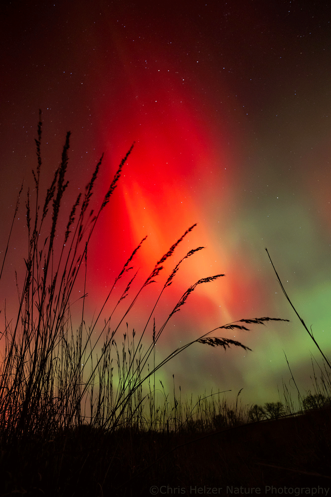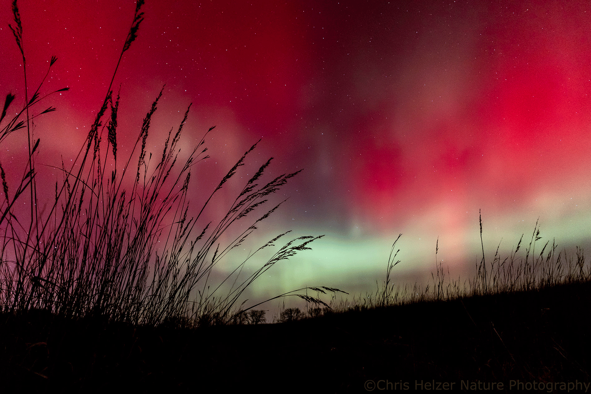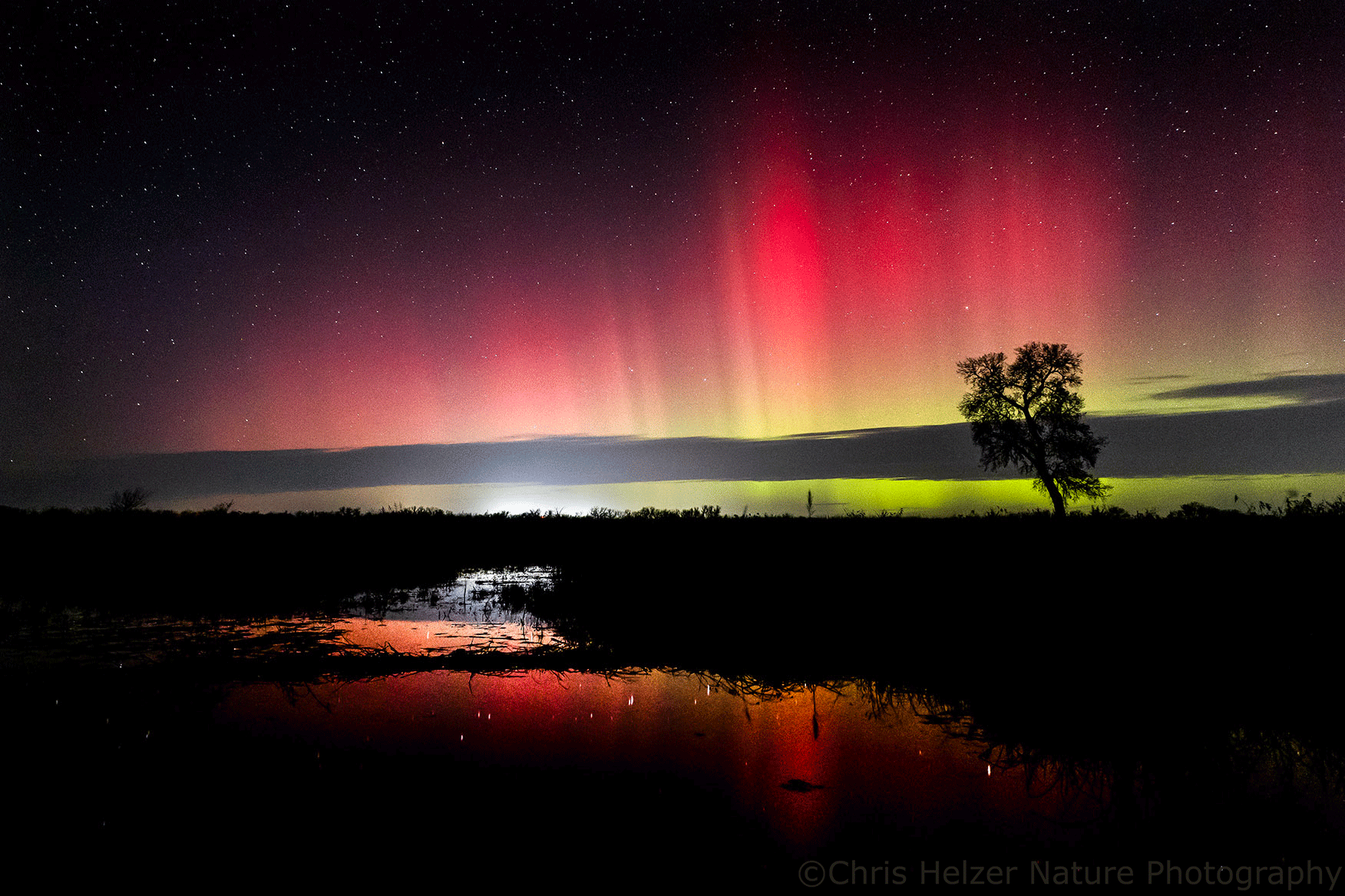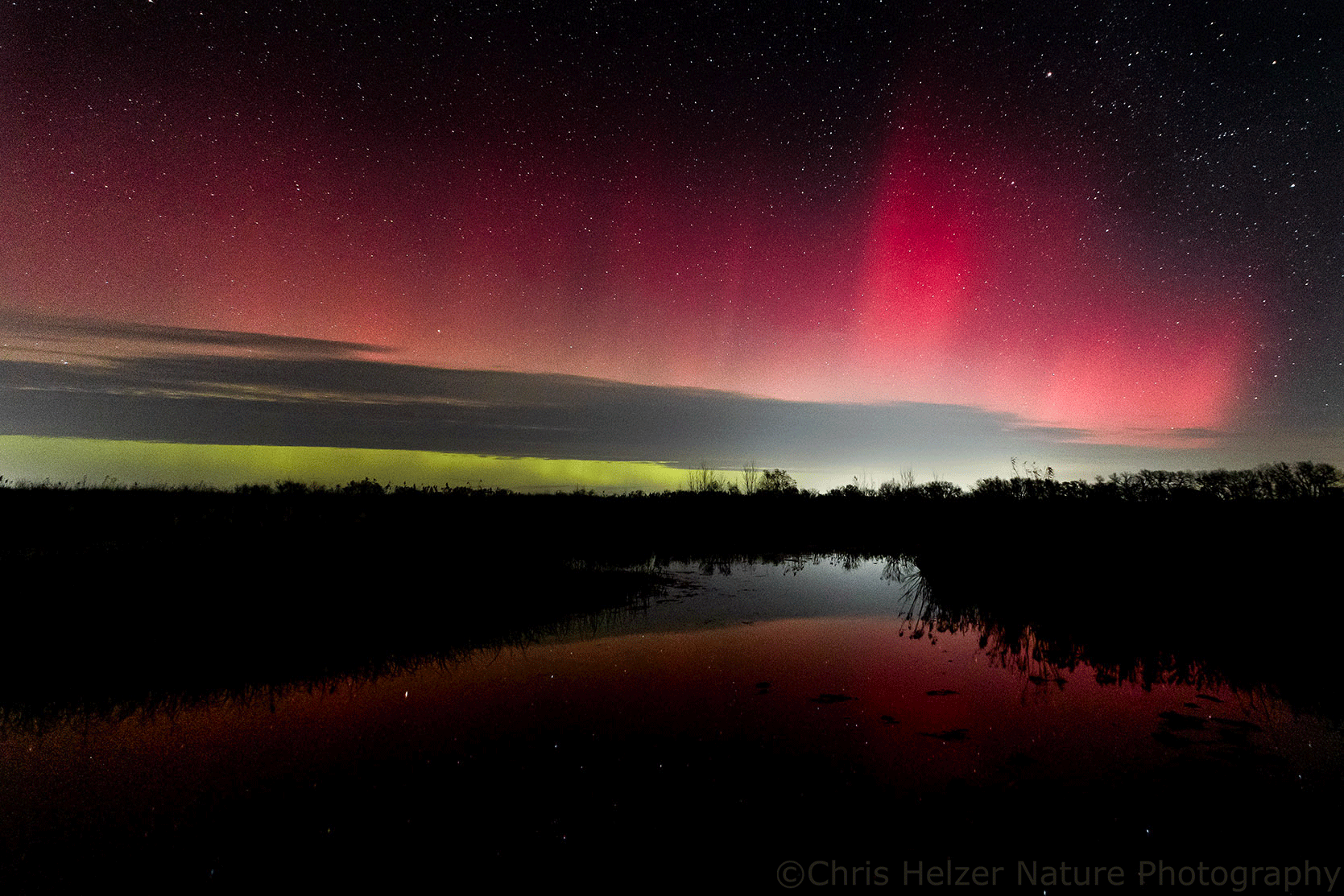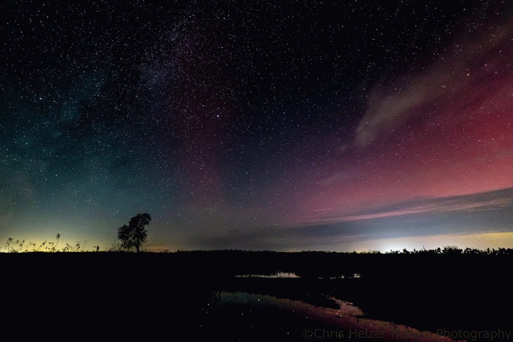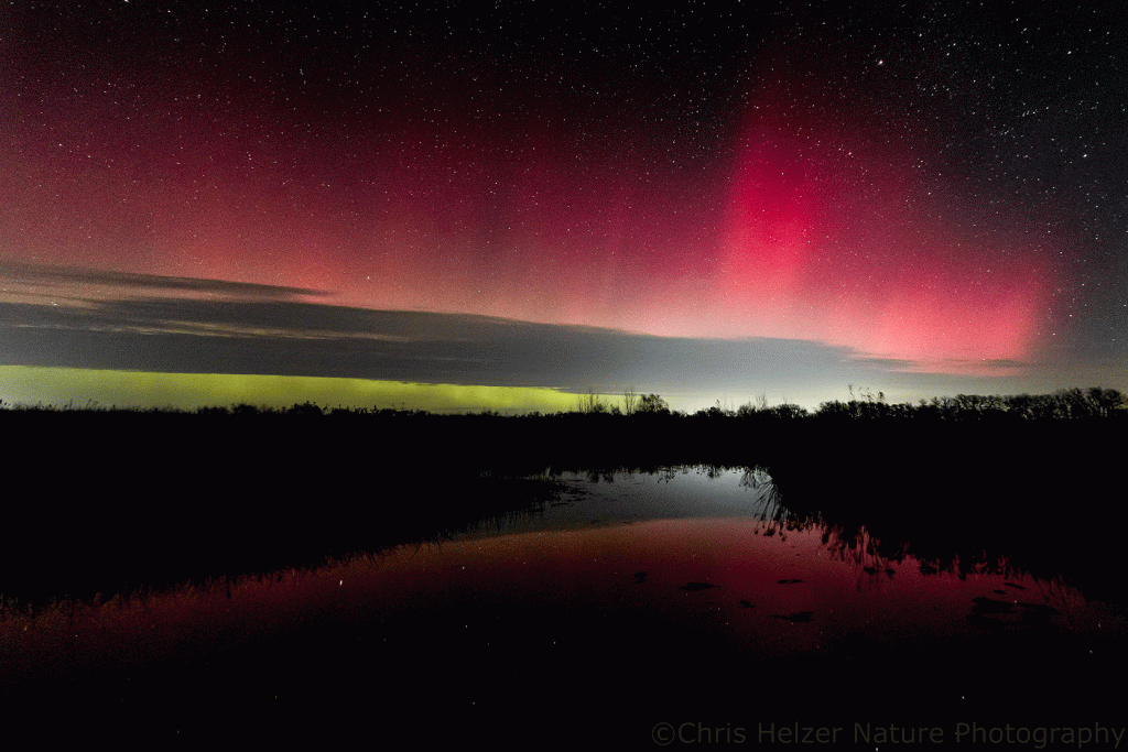 On Wednesday, there were clouds in the area and the forecast for good northern lights visibility was uncertain. I decided to chance it and made a run out to the Platte River Prairies and my favorite restored wetland to see if I could get some reflections in the water. Right when I arrived, the show was terrific, but it didn’t last long.