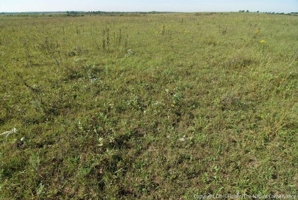 This is one of our restored Platte River Prairies at the end of August of this year. The grasses were grazed hard all season, and eventually went dormant during a hot dry spell. Many of the forbs were also grazed, but not all of them. This part of the site will likely be very weedy looking next year.