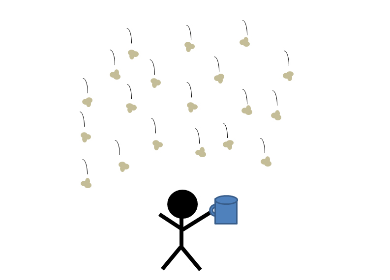 Here’s a goofy but perhaps useful analogy. Imagine that prairie conservation is like trying to catch hundreds of pieces of popcorn falling from the sky. In order to save a species (a piece of popcorn), you have to catch it as it falls. Managing small prairies is like trying to catch all of that falling popcorn in a coffee cup. Because the cup is small, the task is impossible. If you move one way to catch some popcorn pieces, you’ll miss others. And even if you’re really agile, your cup isn’t big enough to hold all the popcorn anyway – so you’re doomed to failure before you start.