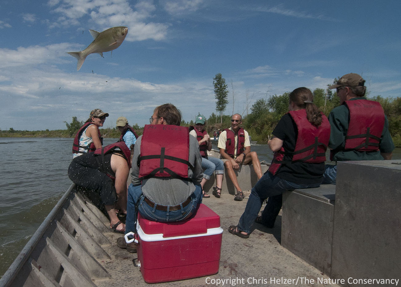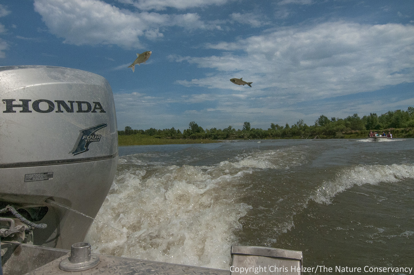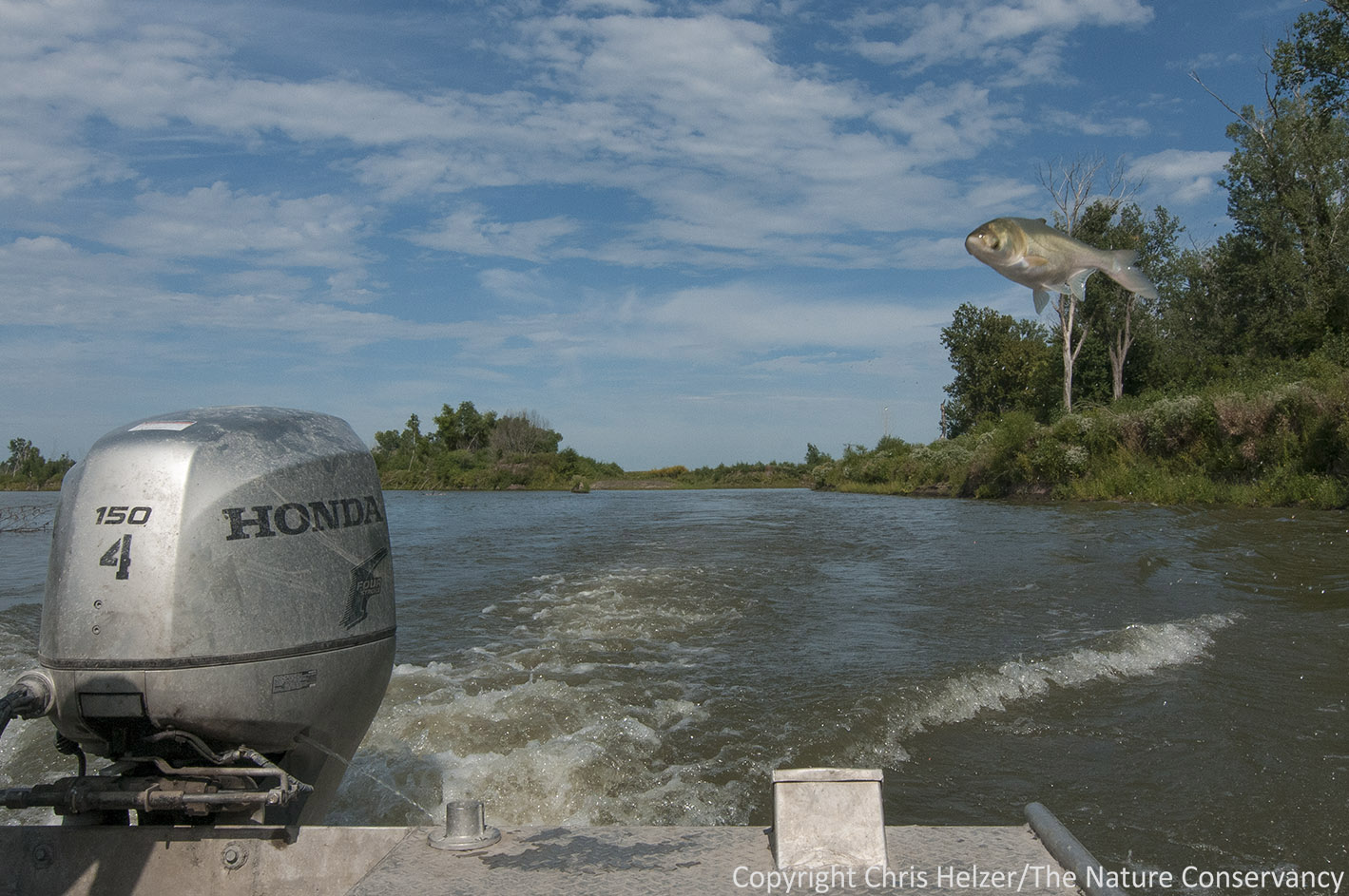 While there are concerns about what the impact of silver carp (and other Asian carp, including bighead and grass carp) will be on the Missouri River ecosystem, those of us on the boat tour last week were mostly concerned about ducking them as they came flying past or into our boats. It turns out that silver carp have a propensity to jump (up to 10 feet!) out of the water in response to the vibrations caused by boat motors. This wasn’t much of an issue in the main channel of the river, but as soon as we entered any side channel or backwater area where the water wasn’t strongly flowing, silver carp started flying out of the water like big slimy popcorn (or something). Thus, my recollection of the tour and the information poor Gerald was trying to impart to us goes something like this: