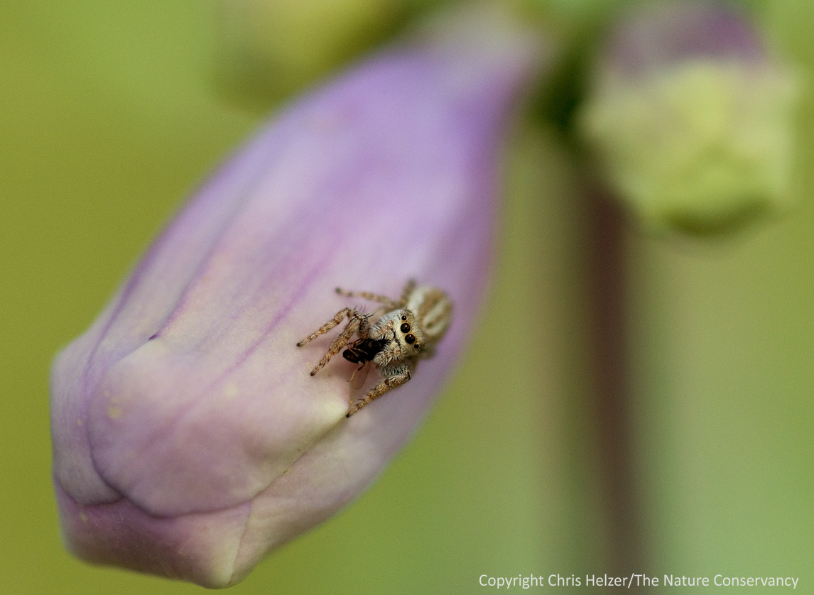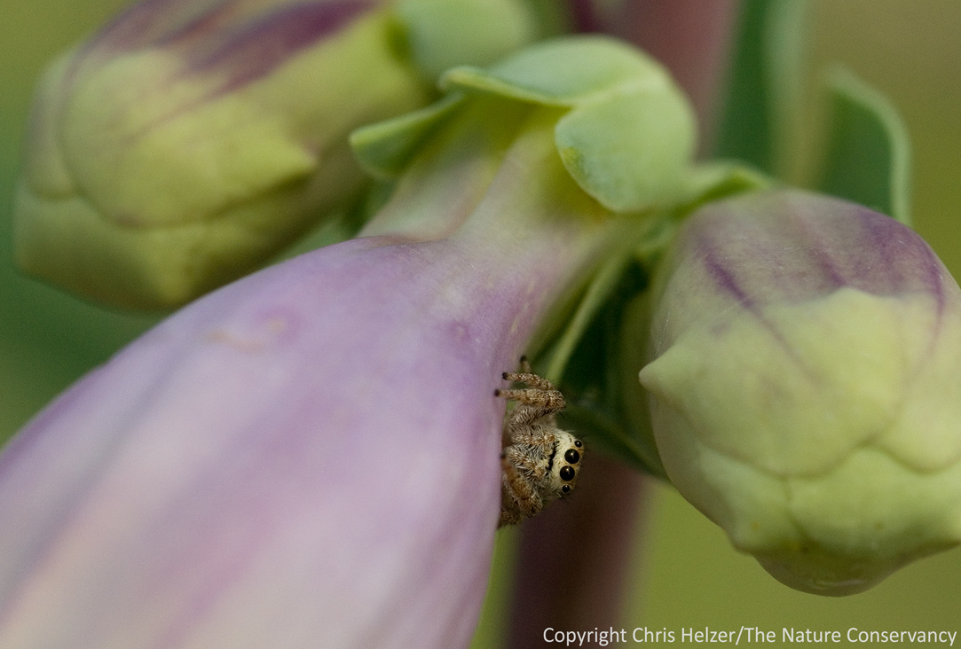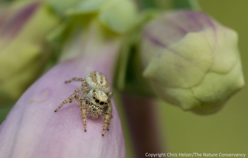 Not long after I got the above photo, I was ready to call it a day, and started walking back to the truck. I was hot and tired, but was drawn to a particular patch of milkweed. As I closed in, a small movement caught my eye. It was another of the shiny little flies. But in a bit of beautiful symmetry, it was being eaten by a shiny little spider!