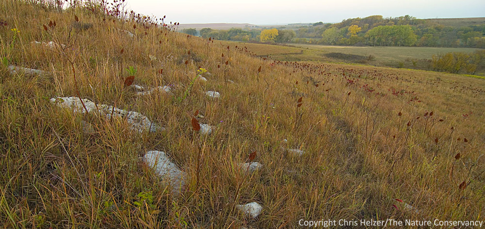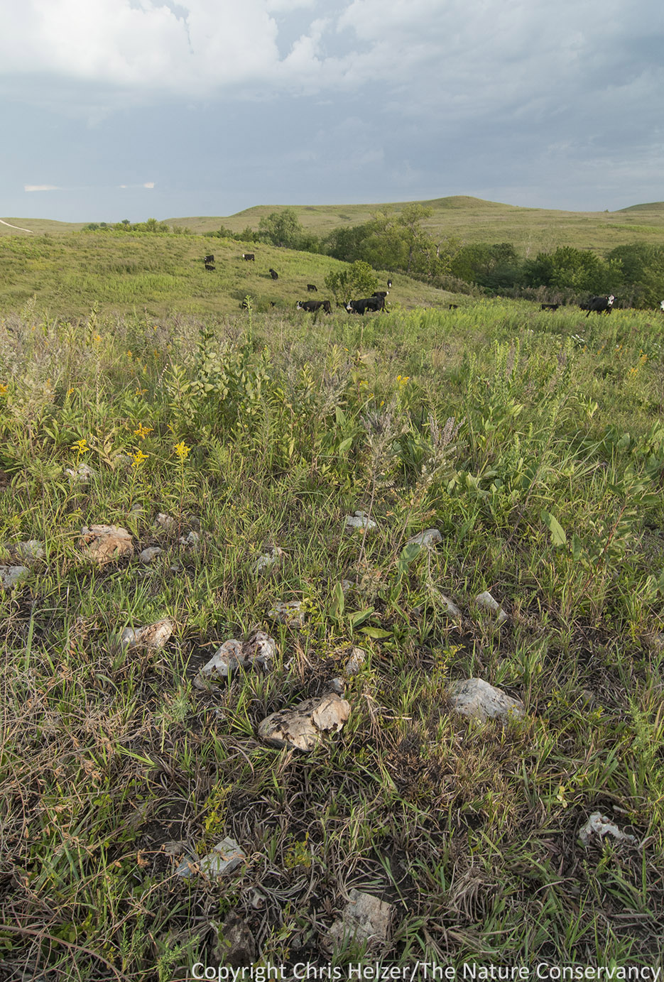 The Flint Hills prairie in Kansas is named for the shallow layers of bedrock beneath the surface. There are also many scattered rocks in the prairie that are easy to see after a fire or grazing event opens up the vegetation.