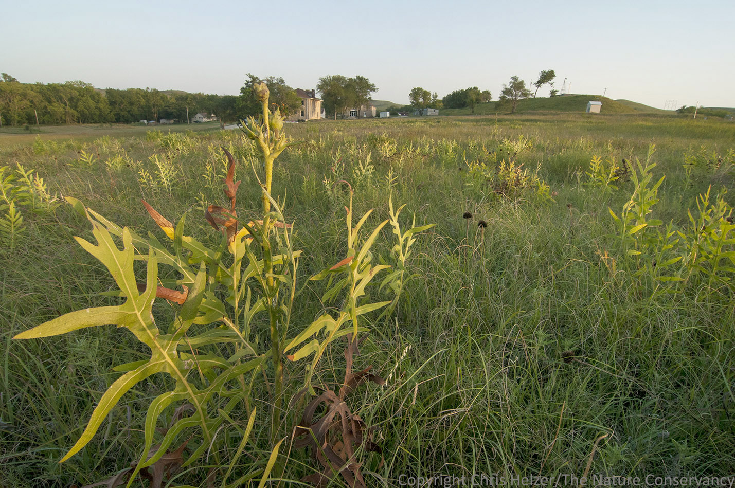 Annually-burned prairie near the headquarters of Konza Prairie near Manhattan, Kansas. It has been very dry there since early summer, so much of the vegetation – including compass plant – is shorter than usual.