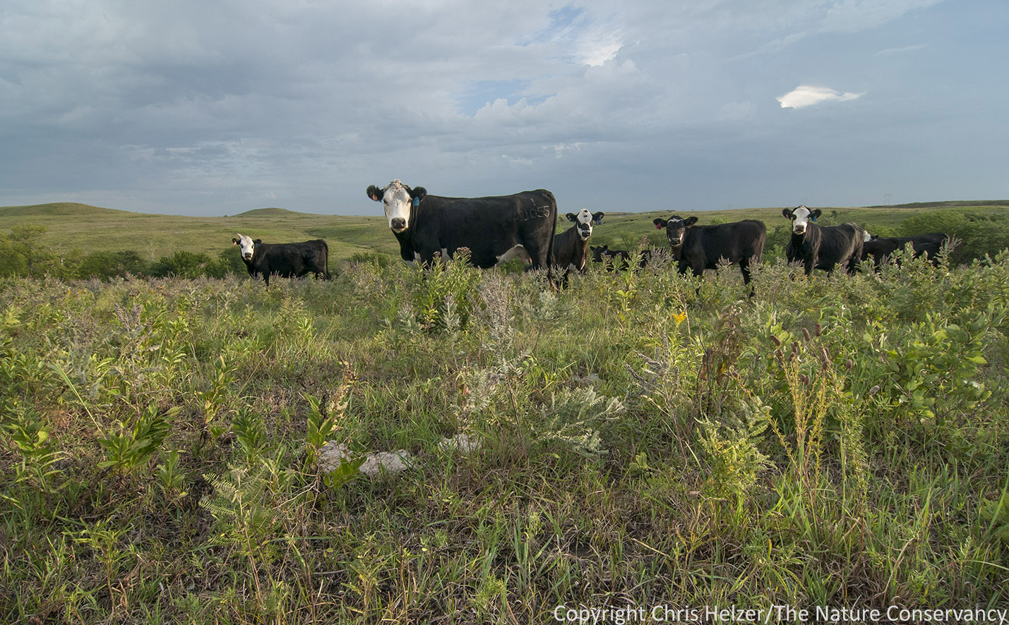 Patch-burn grazing was being used in a portion of Konza prairie. These cattle were grazing in the most recently burned patch, creating habitat of short grass and tall forbs (wildflowers). Ungrazed forbs in this photo includes leadplant and purple prairie clover. Research has shown higher diversity of many invertebrate and other animal groups in this kind of habitat than in more uniformly short or tall grassland habitat.