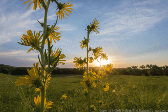In the meantime, one of many highlights of the trip for me was the hour or so of early morning photography I managed to squeeze in right around the headquarters of Konza Prairie.  As the sun came up, I wandered around prairie full of compass plant (Silphium laciniatum), a plant that sorta looks like, but isn’t, a tall sunflower.  There were lots of other plants and animals around too, but compass plant was clearly the star of the show, standing at least three or four feet taller than the surrounding vegetation and blooming audaciously.  It was hard to point my camera toward anything else.  As a result, today’s post is a kind of tribute to compass plant…