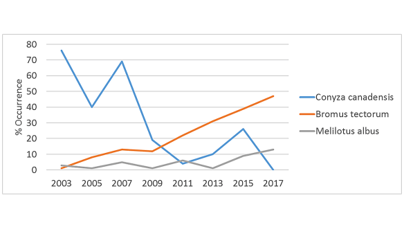 The plants listed on this graph are marestail, downy brome, and white sweet clover, though I lump downy/Japanese brome and white/yellow sweet clover together in my data.