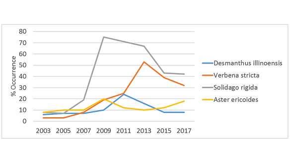 Other perennial wildflowers have had much less predictable paths, with big jumps between sampling periods, during which they (at least) doubled their level of occurrence in my sampling plots. Interestingly, those jumps happened in different years for each species. Having data only from every other year makes it tricky to interpret these patterns, but it seems clear that each of these species is responding a little differently to factors such as climate, fire, grazing, and/or competition from other plants.