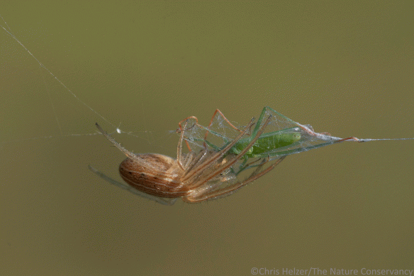 I don’t know what species this is, but this small orb weaver spider was working to wrap and eat a leaf hopper.