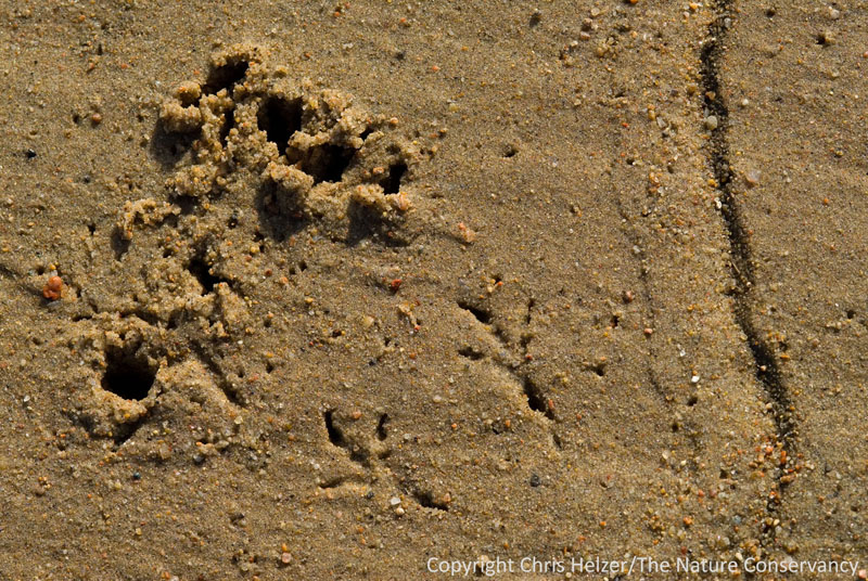 Tracks and holes in the sand where a shorebird was probing for invertebrates along the Central Platte River in Nebraska.
