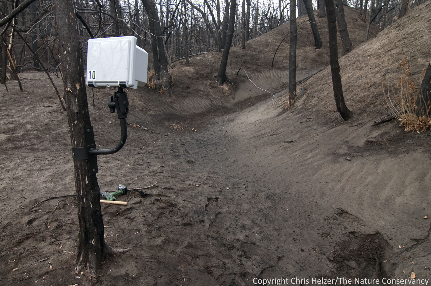 I’ve selected two images from each of three cameras to give you a taste for the kind of stories we’re getting from the cameras. The first pair of images is from the north ridge of the Niobrara River where the wildfire wiped out our ponderosa pine woodland. We set up a camera to capture a close-up view of a steep slope. Overall, erosion is not as bad as I’d feared it might be, but there was some significant soil loss during the first several months of the 2013 growing season, especially on steeper slopes like this one.