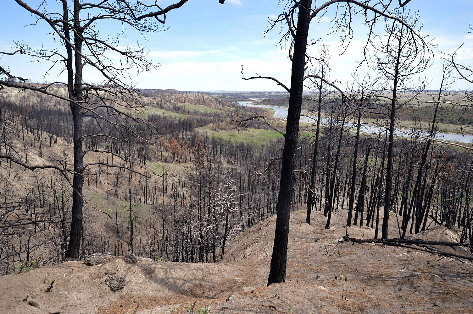 The next pair of images shows a broad landscape view of recovery through the early part of the growing season. Just as in the first pair of images, annual vegetation can be seen colonizing the bare slopes. If you look carefully at the top right quarter of the photo you can see that the sandhills prairie and woodland along the south side of the river is greening up very well. The woodland on that side of the river only burned intensively in a few places; for the most part, flames stayed low to the ground and didn’t impact the trees on the relatively cool, wet north-facing slopes.