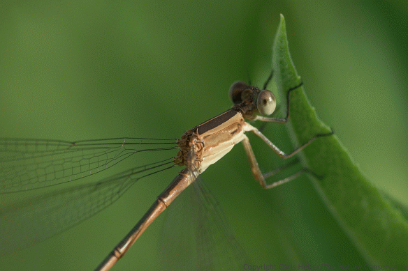 Eventually, I found a few damselflies that let me get close enough for some fairly intimate portraits.  The end results – nice peaceful looking insects resting on perches – don’t paint an accurate picture of the effort invested, however.  The grass stains on the knees of my pants and the sweat pouring down my face were better indicators of that.