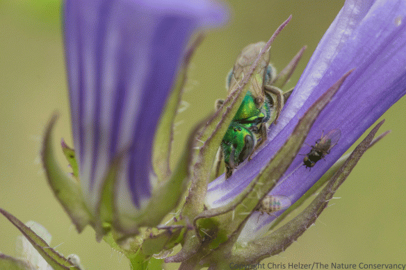 I took a quick walk through one of our restored wetlands last week. Most plants had finished blooming for the year, but in some recently-mowed patches, there were some scattered flowers of beggarticks (Bidens sp) and blue lobelia (Lobelia siphilitica). I knelt down to look more closely at some small bees I spotted crawling around on the lobelia flowers.