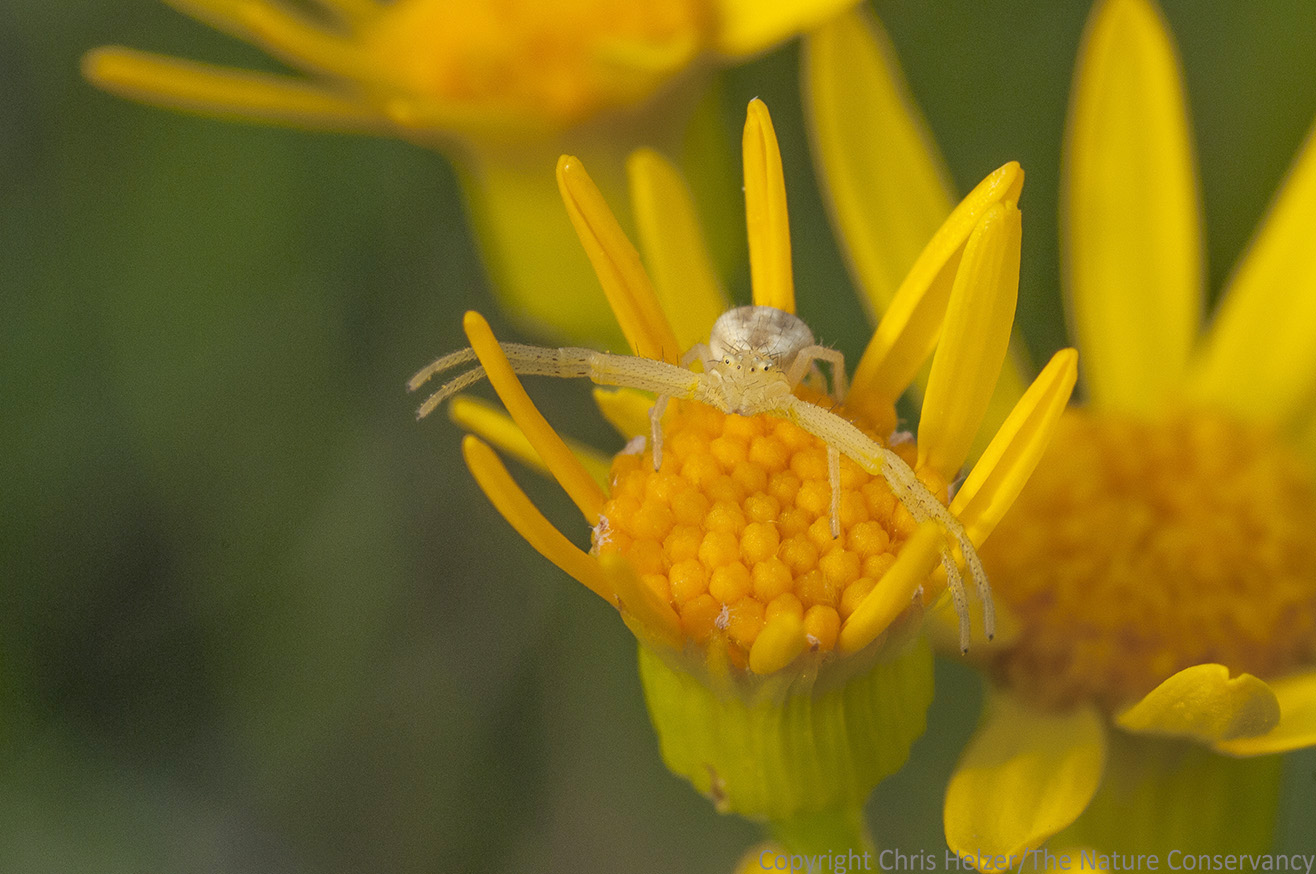 I must have seen two dozen crab spiders before I got this photo. All the rest of them crawled beneath the petals when I approached, or dropped to the ground if I kept coming. This one just sat there.