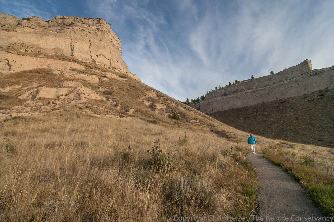 A hiker enjoys the paved trail and gorgeous weather at Scotts Bluff National Monument.