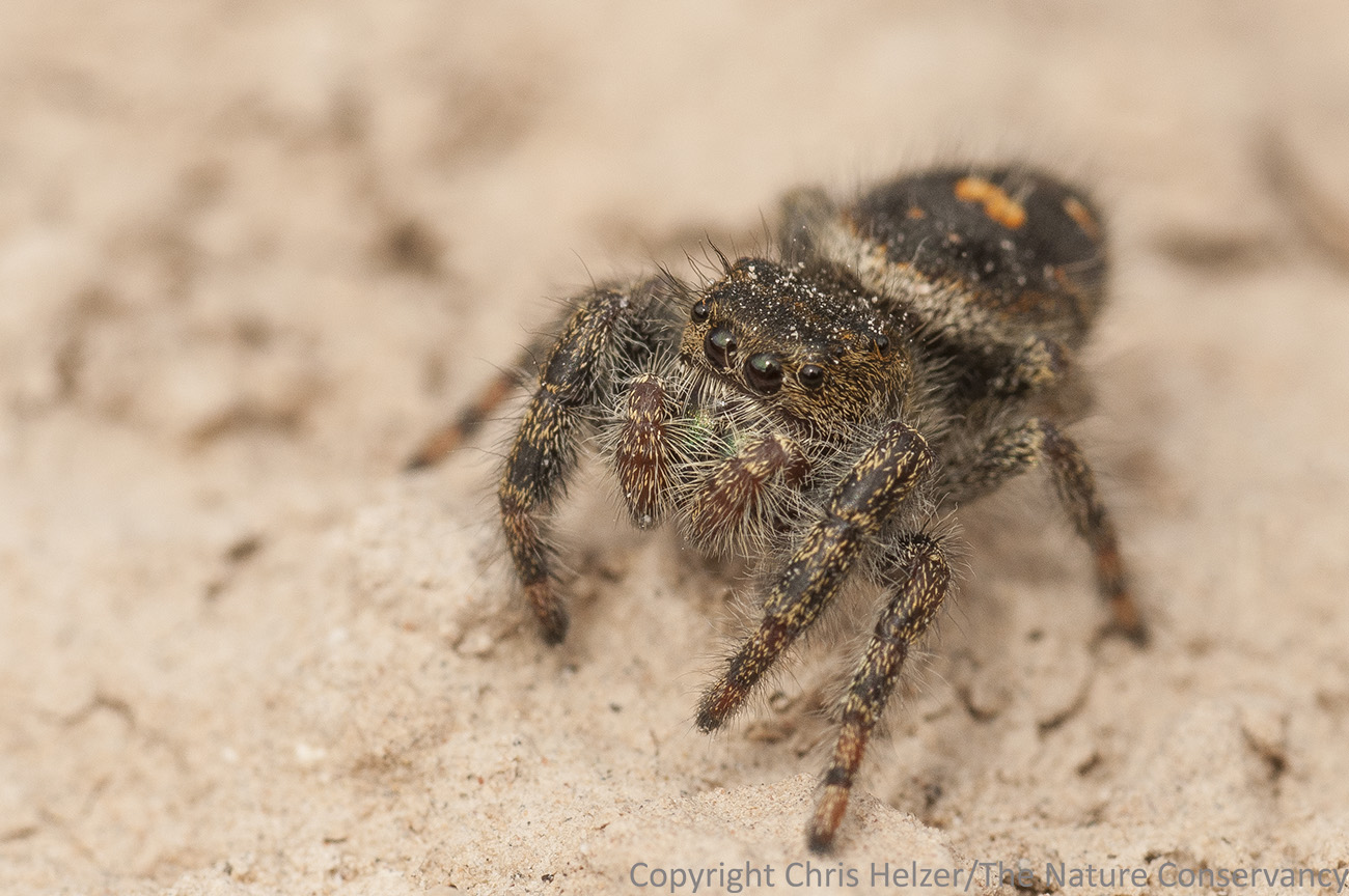 This little jumping spider was hunting on the sandstone face of the rocky bluffs.