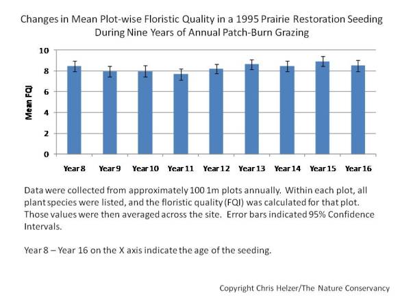 I began experimenting with patch-burn grazing in 2001 because I was looking for a way to maintain plant diversity in restored (reconstructed) prairies along the Platte River in Nebraska. We had invested a lot of time and energy seeding 150-230 plant species into former crop fields and I needed a way to manage them that would prevent grasses from becoming too dominant and/or plant diversity declining over time. I reported some preliminary results of our work in an article for the journal Ecological Restoration in 2005, but now have 9 years of data from our sites. Overall, I’ve been very encouraged by the results I’ve seen. Our restorations are maintaining their plant diversity and species composition – while exclosures that get prescribed fire but not grazing have lower plant diversity and are largely dominated by grasses. I’m also tracking individual plant species and have seen plant species traditionally thought to decrease in abundance under grazing maintain their abundance over 9 years of annual patch-burn grazing.