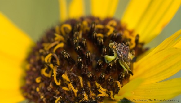 Ambush bug (Phymata americana?) on a stiff sunflower plant.  The Nature Conservancy's Platte River Prairies, Nebraska.