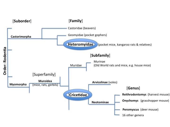 This is a very simplified phylogenetic tree of the Order Rodentia. Phylogenetic trees show the inferred evolutionary relationships among species based on similarities/differences in physical and/or genetic characteristics. So whenever two branches come together, it’s understood that the join represents the most recent common ancestor. FYI, there are a lot of other critters in the Order Rodentia that are not shown; there are 5 suborders I’m not showing and many branches that diverge from those suborders. Also length of lines is for convenience and doesn’t represent any timescale.