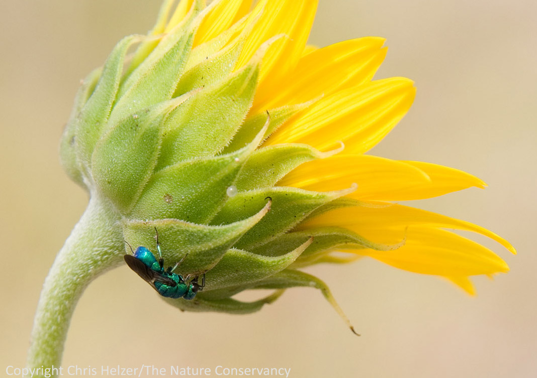 A cuckoo wasp rests on an annual sunflower. These wasps lay their eggs in the nests of solitary bees, and the wasp larvae hatch and devour the young bee larvae and their provisioned food. Thanks to Mike Arduser for the identification.