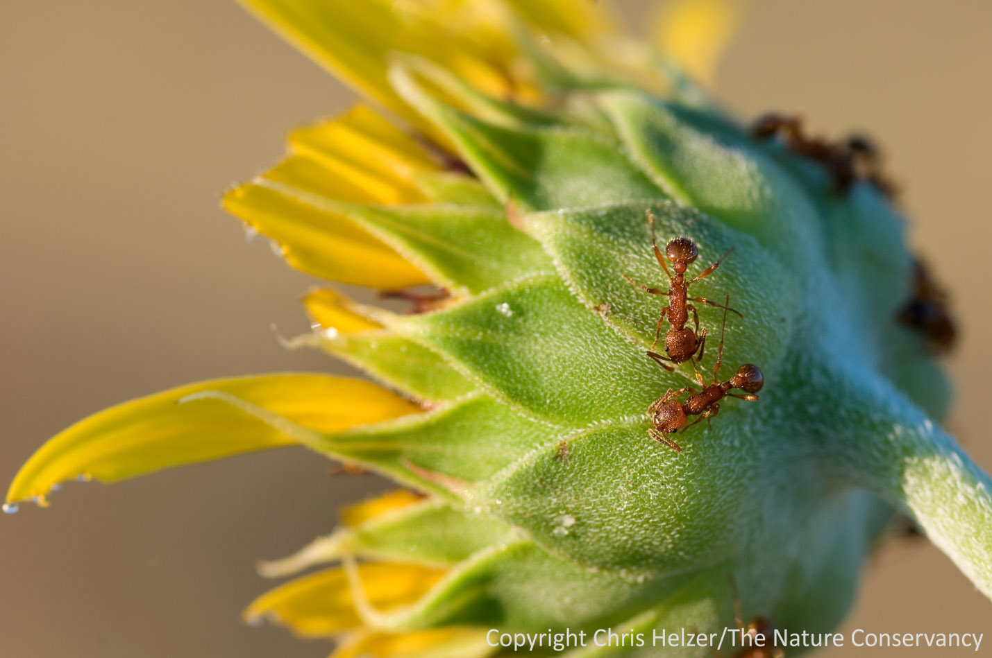 Ants have their own reasons for appreciating sunflowers – largely independent of the big showy flowers. Sunflowers produce and excrete sweet sticky sap (known as extra-floral nectar) that attracts hungry ants. It’s thought that attracting ants in this way might help repel herbivorous insects that might otherwise feed on the sunflower’s leaves and stems. Ants are not predators to mess with if you’re a hungry caterpillar or other plant-eating insect…