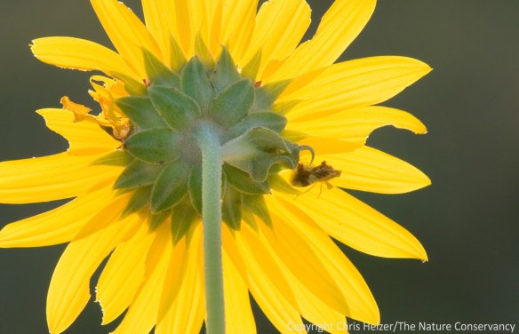While most other plants have given up on this year’s growth because of the very low soil moisture, these annual sunflowers are acting like it’s party time. I imagine the long taproot helps the plant get deep moisture, but its root system isn’t any bigger or deeper than many other sand prairie plants, which sit brown and withered in the surrounding landscape. Of course, being annual plants, plains sunflowers don’t really have the option that perennials do to just shut down for the remainder of the season during stressful years. Once a plains sunflower seed germinates, it’s got exactly one growing season to flower and make seeds before it dies. If it had a motto, it would be something like “Live like there’s no next year!”