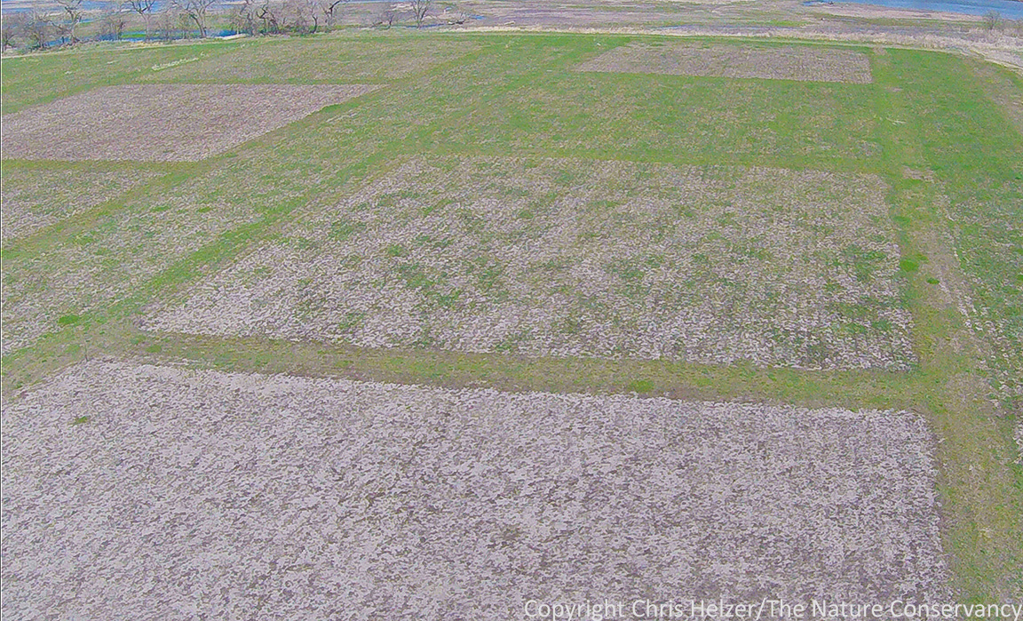 Several years ago, we created some research plots to help us learn more about how plant diversity interacts with ecosystem function. As you can see above, the plots include a grid of squares (3/4 acre in size), each planted with one of three seed mixtures: monoculture (big bluestem), low diversity (grasses and a few forbs harvested in the fall), and high diversity (100 species). Working with academic partners, we have several research projects underway, including a couple that demonstrate the influence plant diversity has on the spread of invasive plant species.