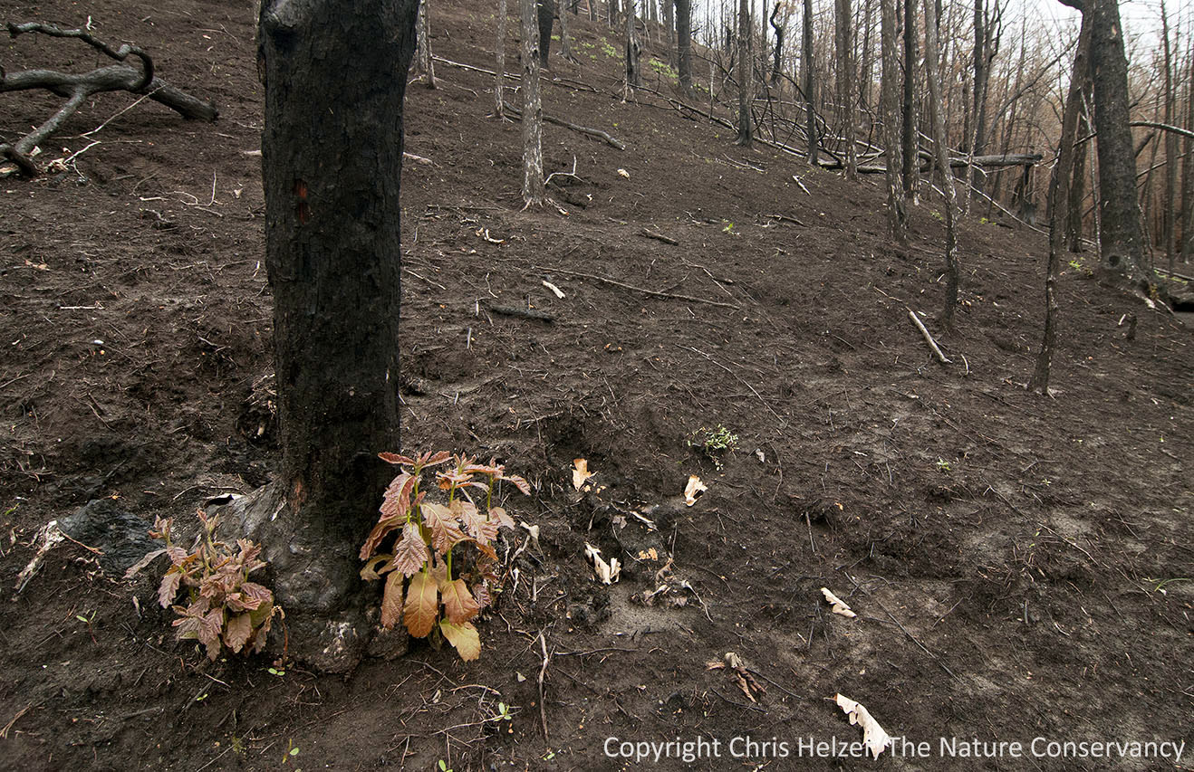 Most oak trees were resprouting from their bases.  Oaks that had been burned less intensely hadn’t started their spring growth at all this year, so it’s still unknown whether some of those will be able to continue growing from the ends of their branches.  Unburned oaks were leafing out, so we should see something from the “lightly” burned ones in the next couple of weeks.