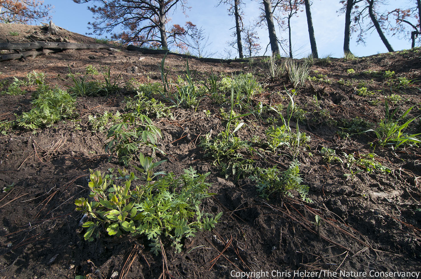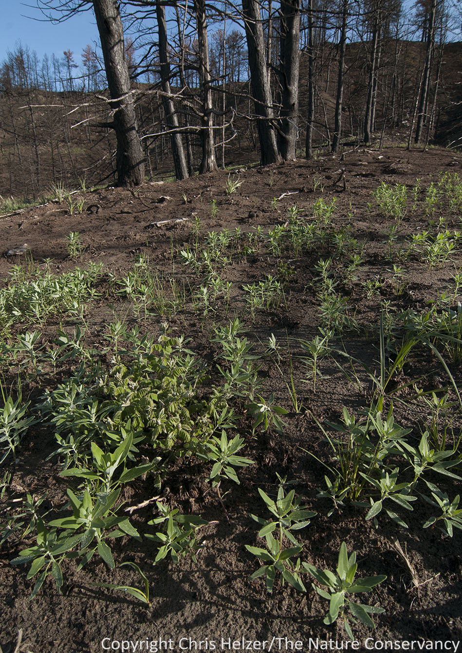 However, as I climbed the ridge north of the river, I was pleasantly surprised.  There was some soil erosion, but much less than I’d expected.  Green plants were popping up across the ridges, forming thicker carpets in areas where tree density had been lower.