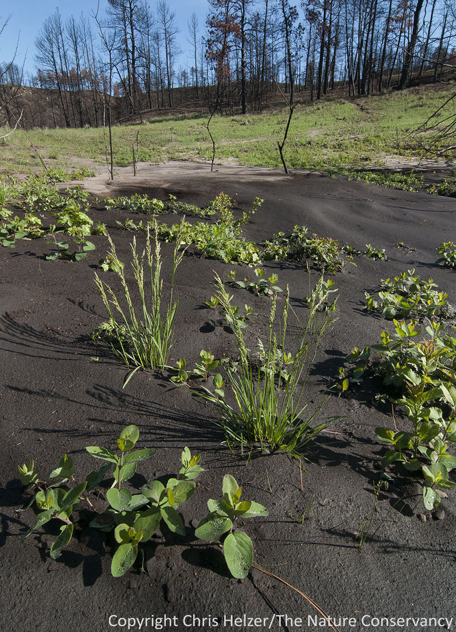 Many of the green plants were “weedy” annuals, taking advantage of the sudden lack of competition for light and moisture.  However, numerous perennials were growing too – including leadplant, puccoons, skeleton weed, peavine, several species of grasses and sedges, and many more.