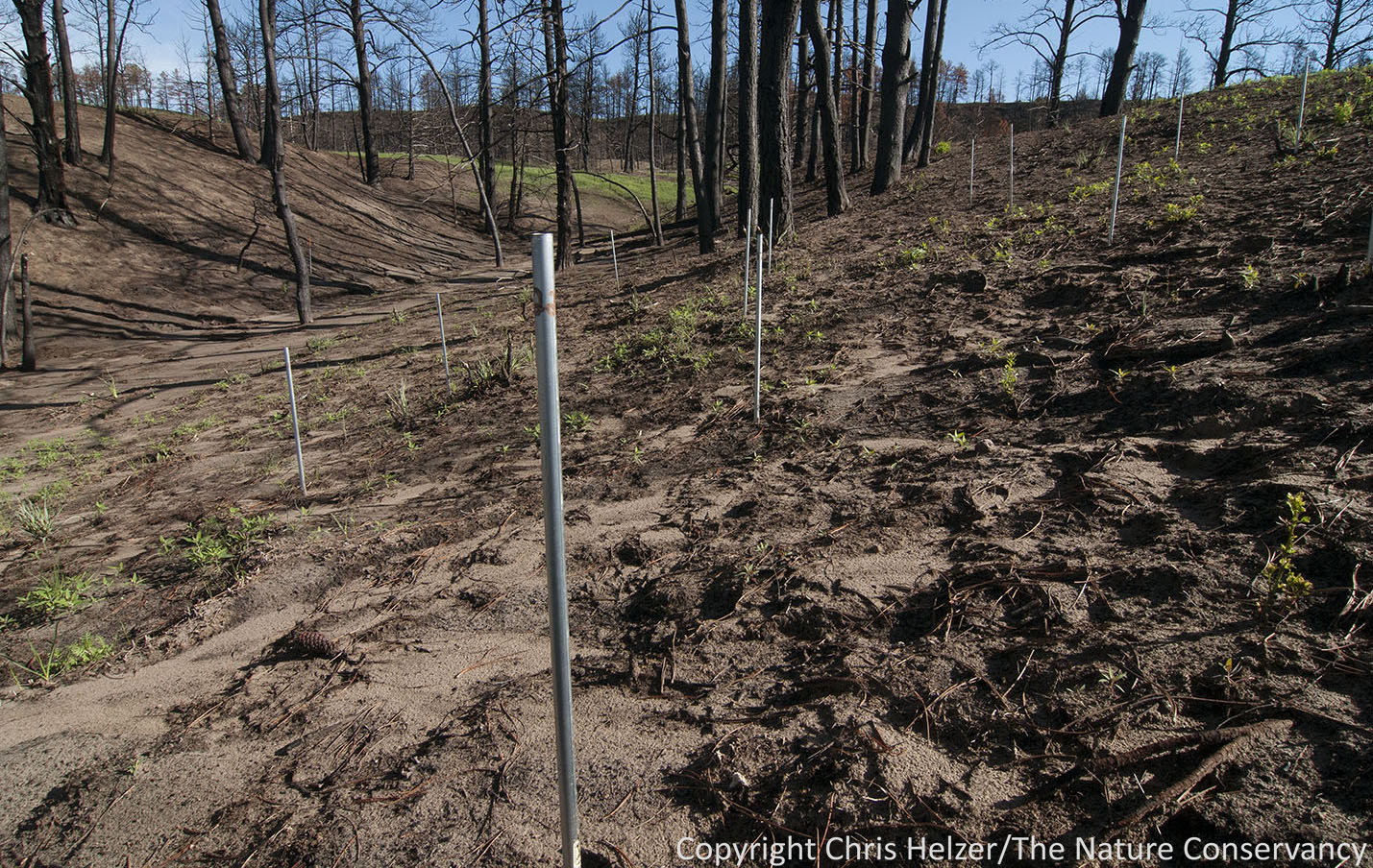 We have erosion pins in a number of places to help measure soil loss.  The pins were installed in December and are being measured right now to see how much soil we’ve lost.  The arrays of pins are located on a range of site types, varying in slope, aspect, and vegetation type.  Additional erosion pin arrays will be installed in the coming weeks.