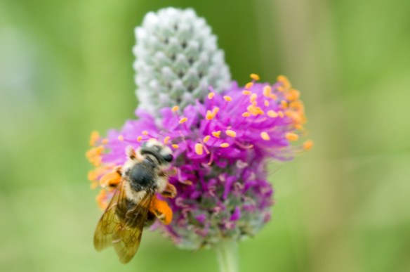 With insects, and really all animals, it’s critically important to get the eye(s) in focus, because that’s where the eye of the viewer is drawn. If the eye isn’t sharp, the photo is pretty much junk. So there I was, trying to focus on the eye of a bee that was flying and crawling around flowers like it was hyped up on Mountain Dew. Oh, and there was a good wind blowing the flowers around too. That was fun. In this photo, I didn’t manage to get ANYTHING in focus – mainly because the flower and bee were both moving too fast.