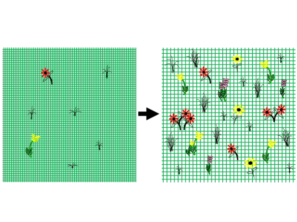An illustration of a floristically diverse prairie (left) with several large patches of an invasive plant.  When dealing with many invasive species, we can focus on reducing the size of infestations in order to restore a more diverse plant community.