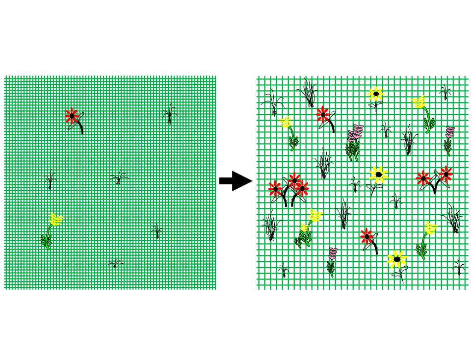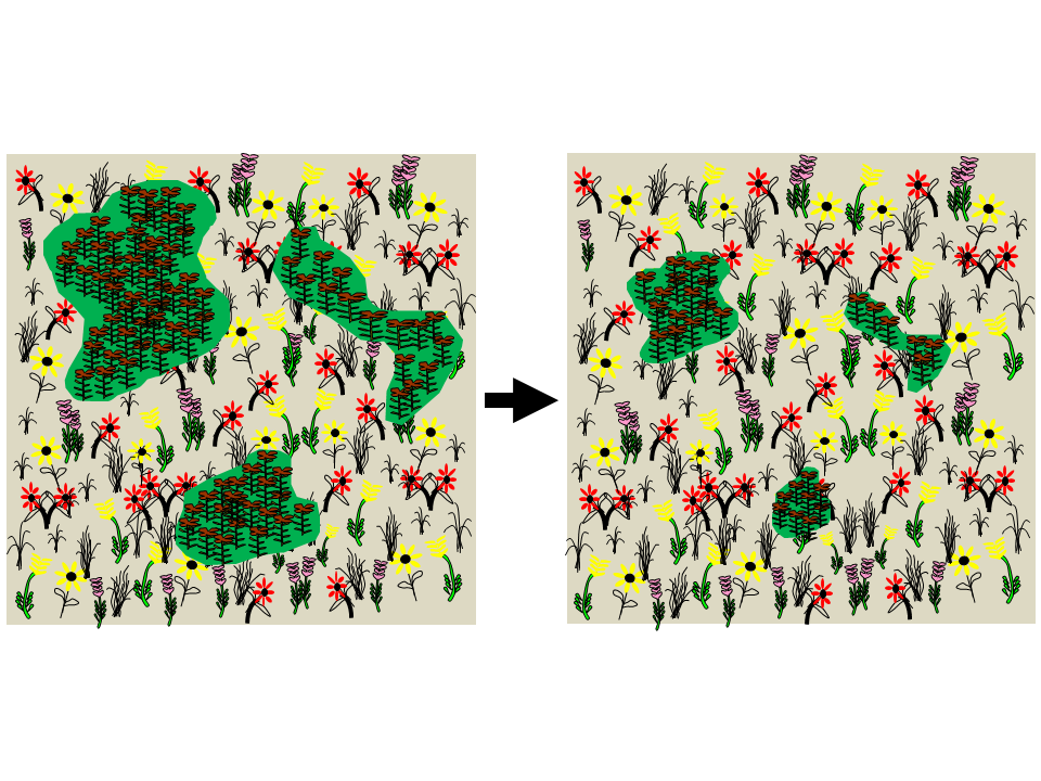 An illustration of a floristically diverse prairie (left) with several large patches of an invasive plant.  When dealing with many invasive species, we can focus on reducing the size of infestations in order to restore a more diverse plant community.