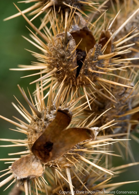 Here is a photo of the seed pods of a very common prairie plant in Nebraska. I wonder how many readers can identify it? The spiny pods are approximately the diameter of a dime.