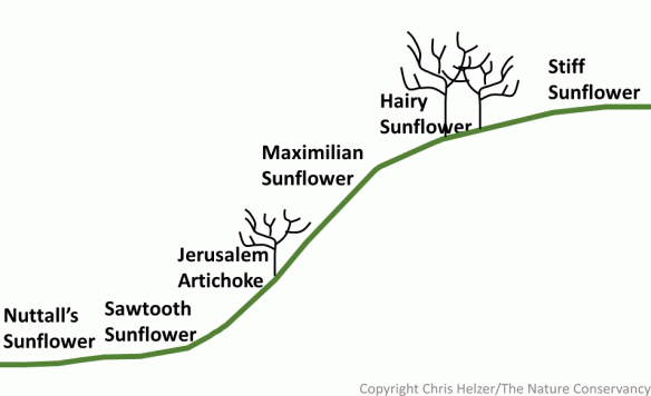 An illustration of the general habitat preferences of several perennial sunflowers found in Nebraska. The variety among habitats used by these species makes it likely that some kind of perennial sunflower will persist in most locations, regardless of how climate and disturbance patterns change over time.