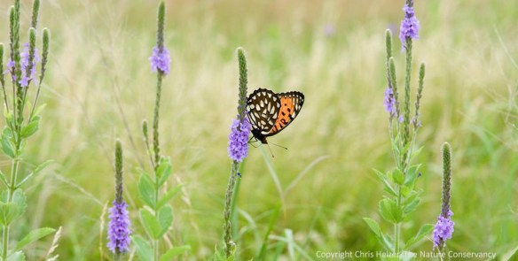 Regal fritillaries in the central Platte River valley really like hoary vervain (Verbena stricta) as a nectar plant. Vervain survives intensive grazing very well, so it can be abundant in some of our more degraded pastures, as well as in our restored prairies.