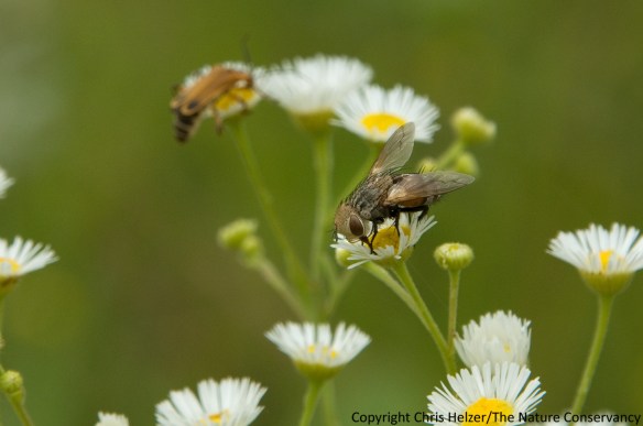 The effects of prescribed fire on regal fritillaries and other butterflies is a frequent topic of discussion among ecologists. At our sites, we definitely see the highest numbers of regals emerging in June and July from prairies with high numbers of violets and with a build up of thatch. Prairies that were burned in the spring have very few fritillaries during that peak period of emergence and mating – the larvae almost surely perish in spring fires. However, during the summer of 2011, two of our top three sites for nectaring activity had been burned in the spring of that year. It may be that in landscapes of relatively abundant habitat, a mixture of burned and unburned areas can complement each other by providing high quality larval habitat (unburned) and nectaring habitat (burned).