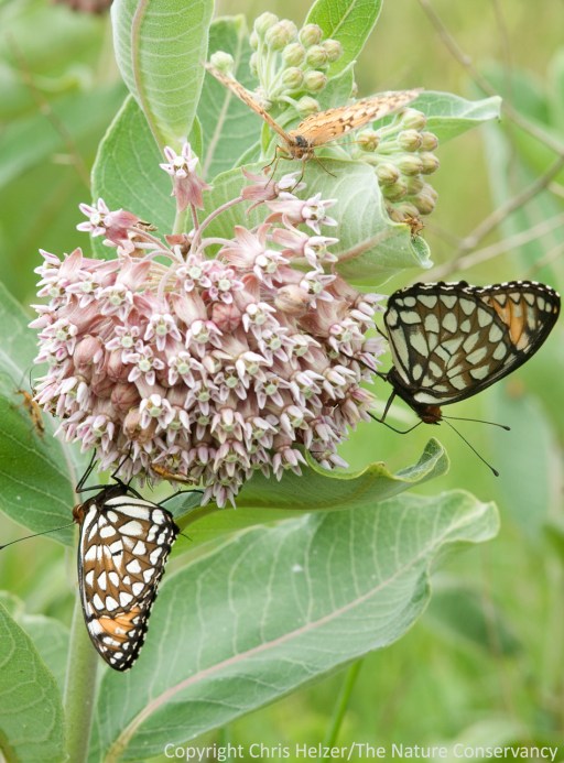 Clearly, regal fritillaries managed to survive just fine along the Platte River before our restored prairies were available, so it’s not that we’ve saved the species through our restoration work. Intensively grazed pastures tend to have high numbers of hoary vervain flowers for nectaring, and some hayed prairies in the valley contain good numbers of milkweeds and other nectar species as well. However, watching the behavior of fritillaries when areas of high nectar plant abundance (e.g., our restored prairies) become available may tell us about what their preferred habitat conditions are.