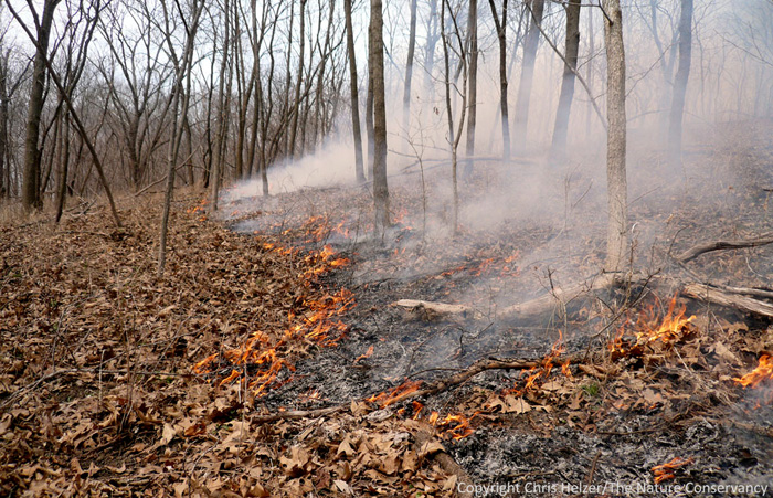 We’d hoped to burn the site earlier in the spring before the herbaceous plants in the woodland started growing. As it was, the woodland floor was just starting to green up a little, but not so much that we were overly worried about the fire suppressing plant growth. More importantly, the leaf litter was dry enough to carry a fire, at least in many places. We started the fire on the prairie ridge tops and let it start backing down the hills from there. Then we lit along the creek at the bottom of the ridge and let the flames run up the hills through the woodland until they met the backing fire in the prairies. (Except that it didn’t really work that way in most places because the fuel – leaf litter – wasn’t continuous enough that the two fire lines actually met each other in many places!) Even after significant interior lighting later in the day, there were still many areas that didn’t burn. We weren’t very concerned about the patchiness of the fire because heterogeneity is a good thing, although there were a few areas we’d really hoped would burn better than they did. We hadn’t expected many of the north-facing slopes to burn well – and they didn’t – because those areas are typically more moist and shaded.