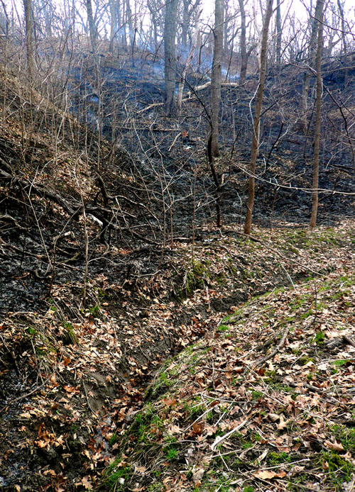 In some places, like this, the oak leaf litter was thick enough that the fire burned fairly continuously. In other places, it didn't burn at all. Draws where leaves accumulated in deep piles often burned with the highest intensity.