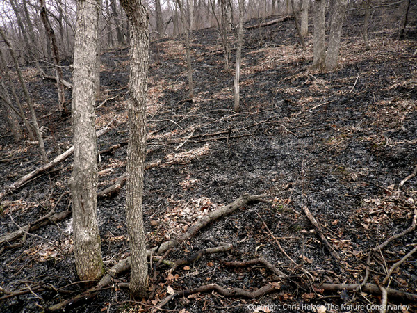 While most of the woodland burned only in patches, some woodland areas, like this one, burned fairly completely - but even here, patches of unburned leaves can still be seen.