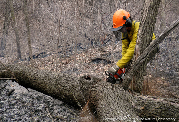 The day after the fire was spent doing mop around the edges of the burn. Here, one of our crew is cutting the burning end off of a log. The burning portion was then pushed/rolled away from the edge and allowed to burn itself out.
